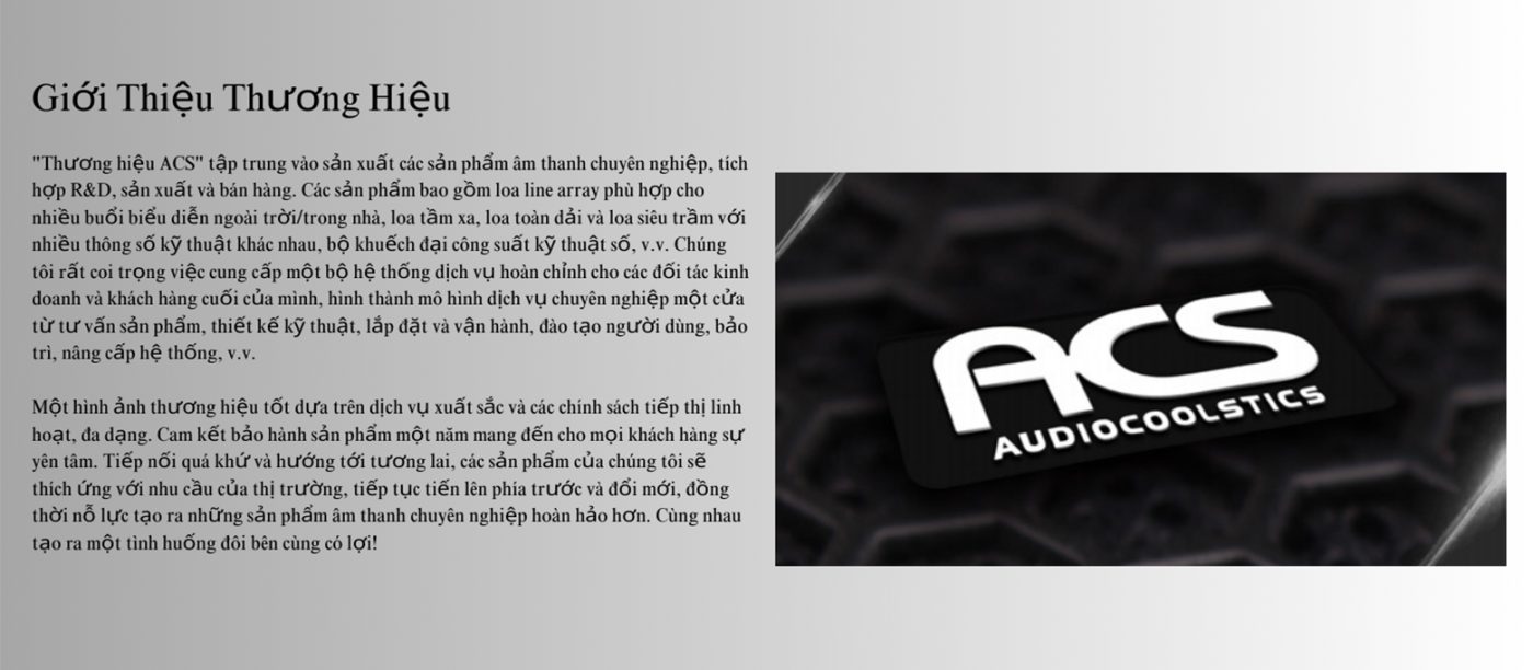 “Thương hiệu ACS” tập trung vào sản xuất các sản phẩm âm thanh chuyên nghiệp, tích hợp R&D, sản xuất và bán hàng. Các sản phẩm bao gồm
