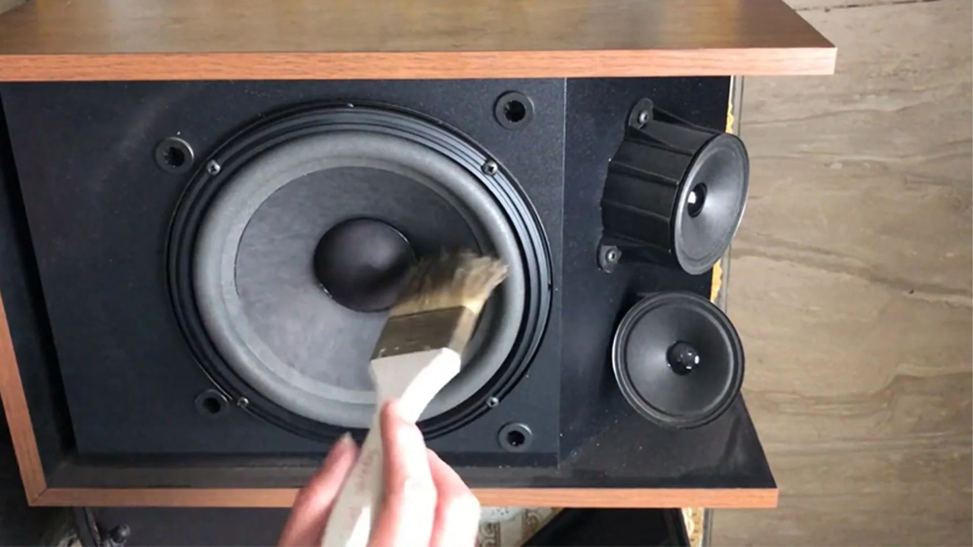 - Dùng chổi mềm hoặc cọ nhỏ để quét nhẹ nhàng lớp bụi bám quanh củ loa, loa bass và loa treble. Lưu ý tuyệt đối không được ấn mạnh hoặc chạm trực tiếp vào phần màng loa vì đây là bộ phận rất nhạy cảm.